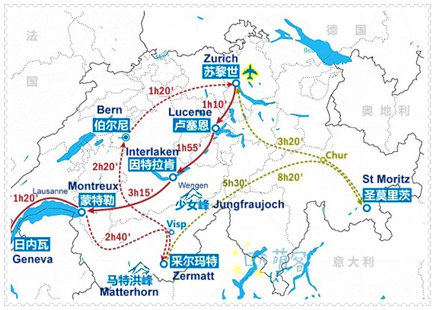 - 瑞士主要地区火车行程时间图(原图来自:欧萌客, 英文地名加注 by yue):