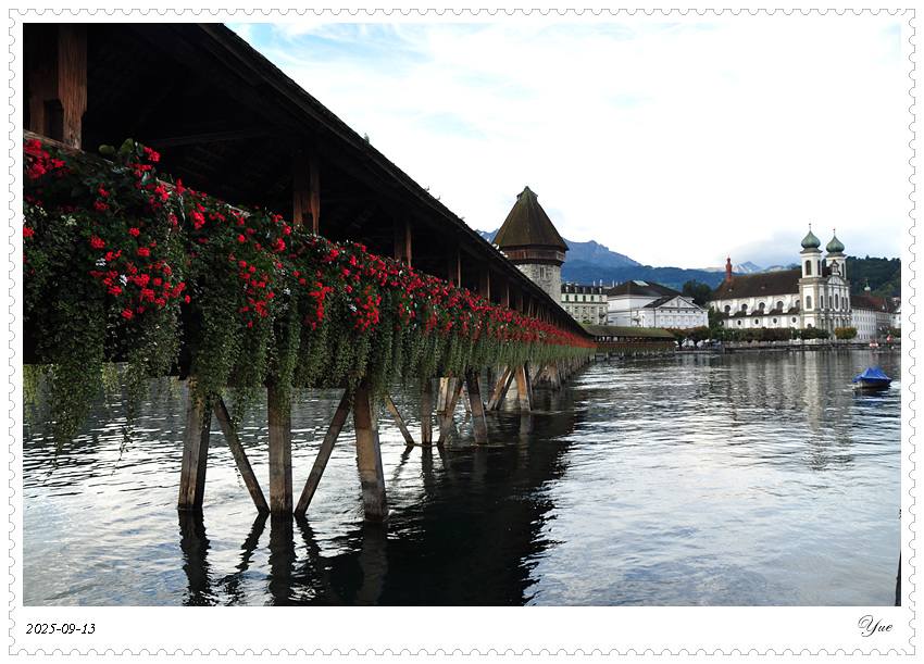 九月的此时,桥上红色天竺葵(Geranium)点缀着些白色的, 配着垂下的绿草,映照着水光,让人移不开眼睛。如果这条桥不是欧洲最古老的中世纪古建筑廊桥 (始于14世纪,1993大火后原样重建), 如果这条桥没有那么弯弯一小折,如果它不是这么长且也不那么长,如果没有附近那个教堂映衬着,如果没有这些花装饰着,是的,如果没有这些花, 我想,我不会在廊桥如此流连忘返。可是,一切就是搭配协调得这么好。