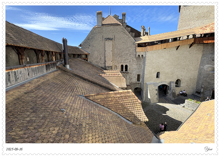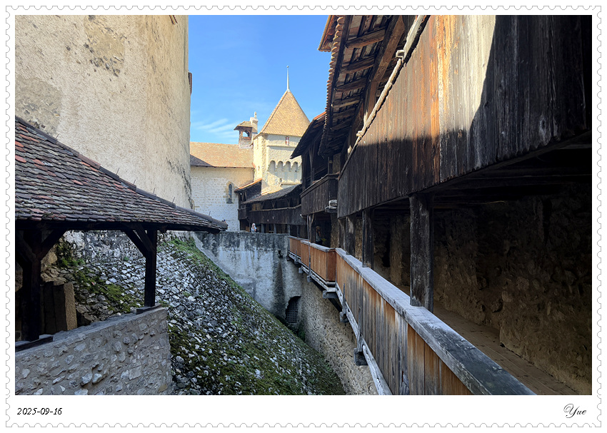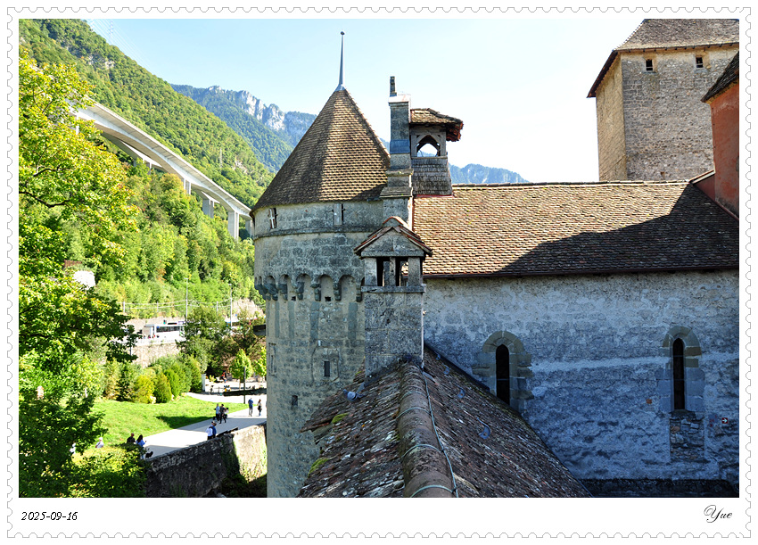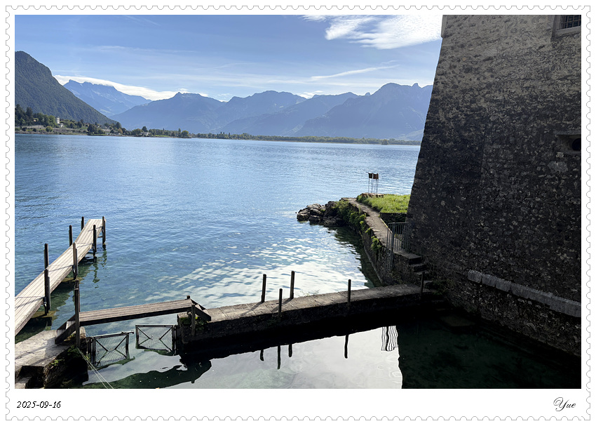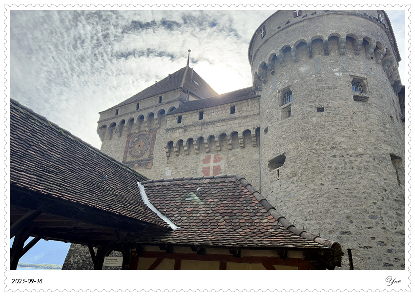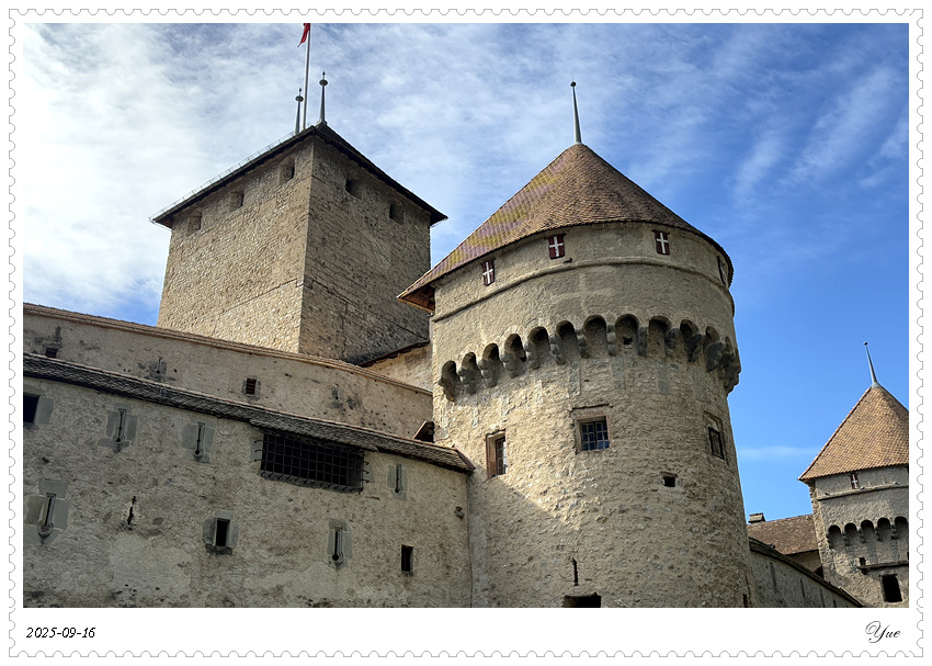 在瑞士, 我们沿途所见的小镇似乎都有一个城堡。日内瓦湖畔的小镇蒙特勒Montreux 也有座城堡, 最著名的那座,被诗人拜伦咏唱成名的,一座中世纪岛屿城堡, 西庸城堡(Chateau de Chillon)。 西庸城堡建在日内瓦湖湖畔的椭圆形岩石岛上, 天然护城河, 环形卫护墙,每个角上也都有圆柱形塔楼,整个城堡包括25座建筑,3个庭院。