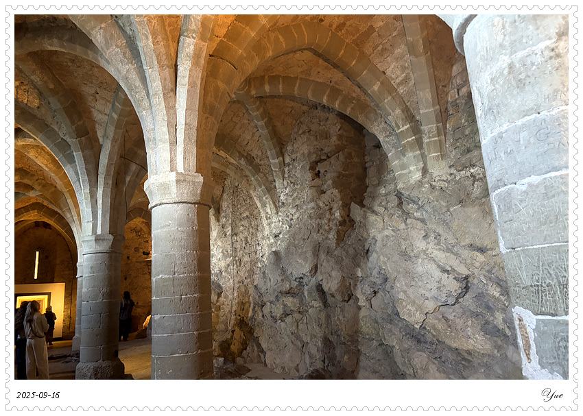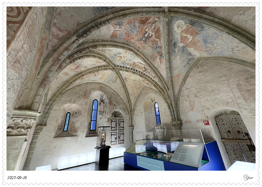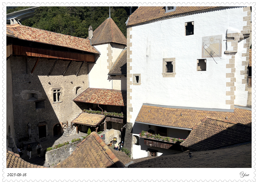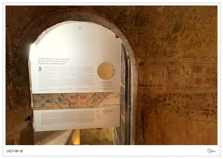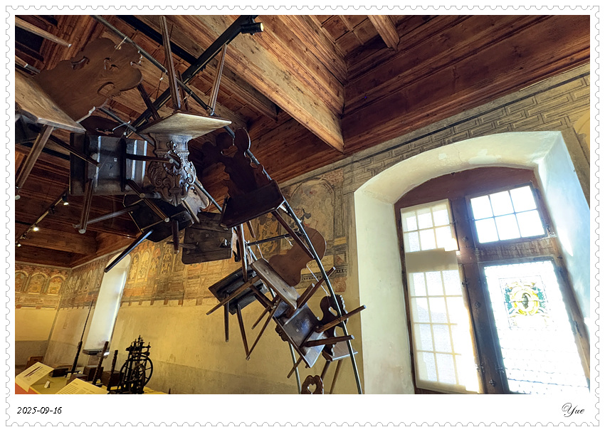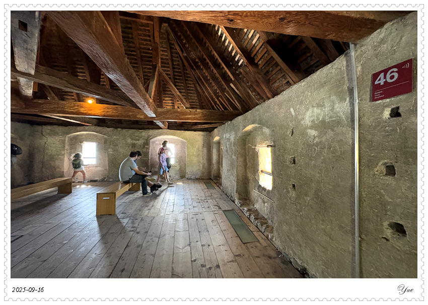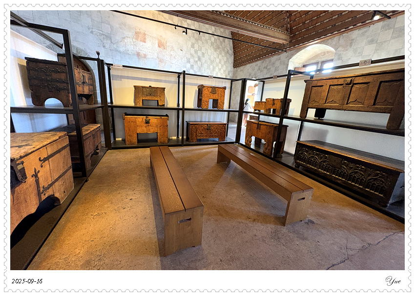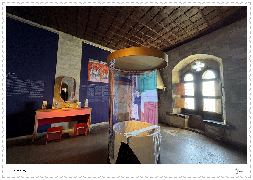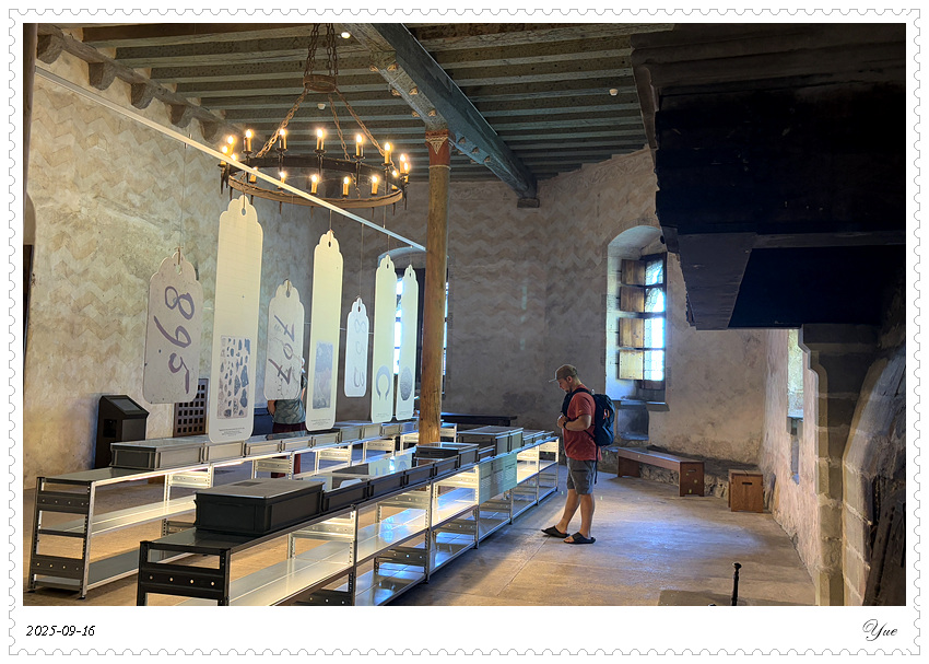 西庸城堡有很详细的介绍书,列出了46个展厅。 我们从1号厅, 上上下下迷迷糊糊,从酒窖餐厅看到正厅卧室浴室再到教堂以及数个珍品屋,穿过几个庭院和亭廊,顺序登上46号塔楼远望。这里有中世纪日常生活的介绍,建筑城堡的介绍, 还有十四世纪的壁画。 当然,还有地下监狱和刑审室, 城堡该有的黑暗面这里也都有。
