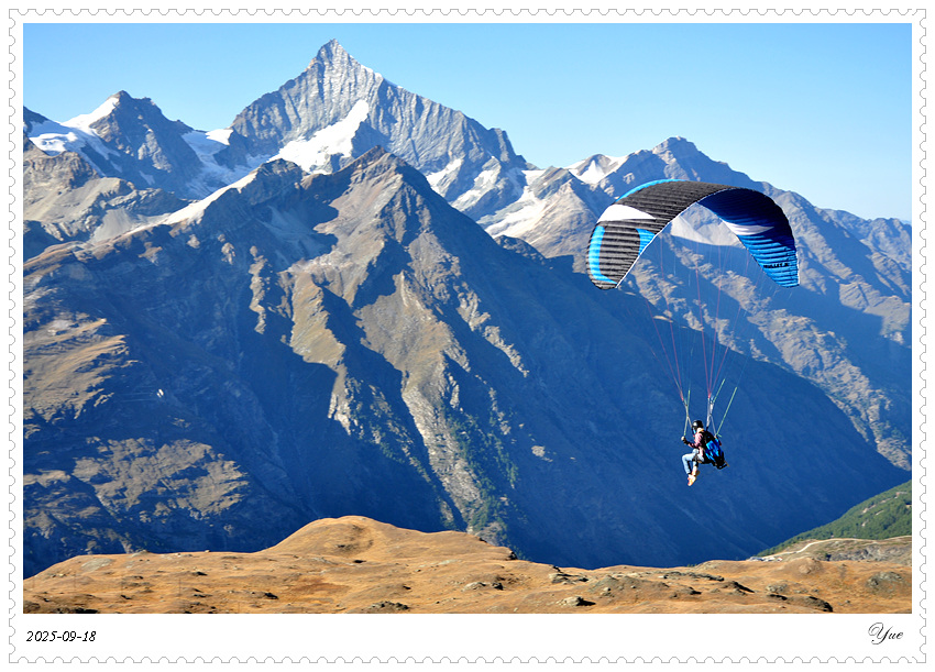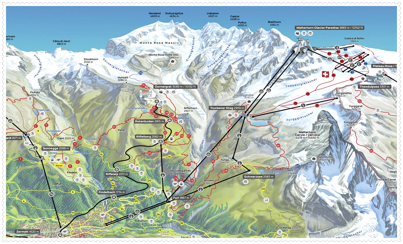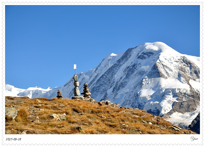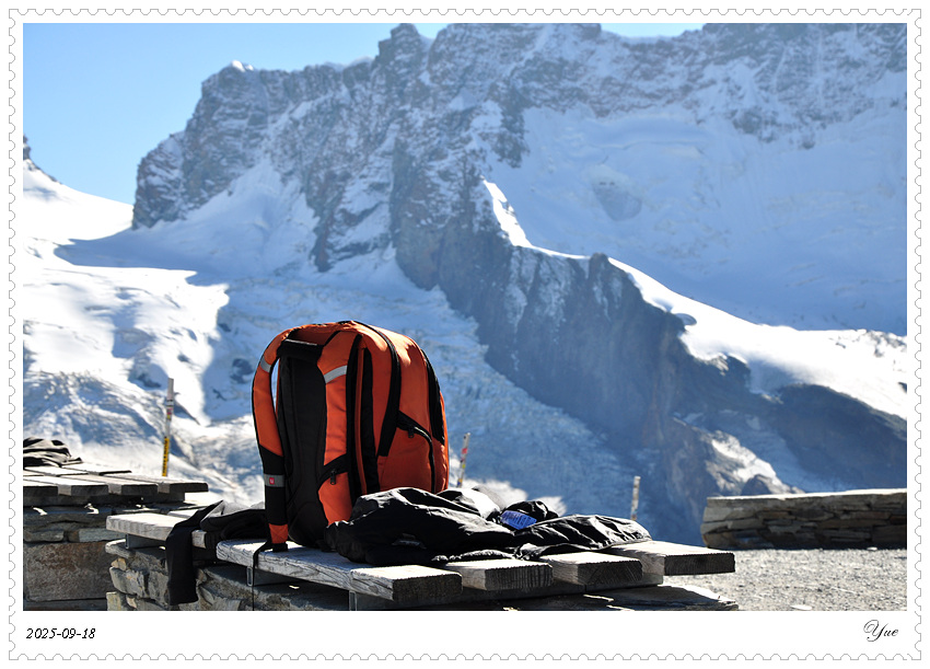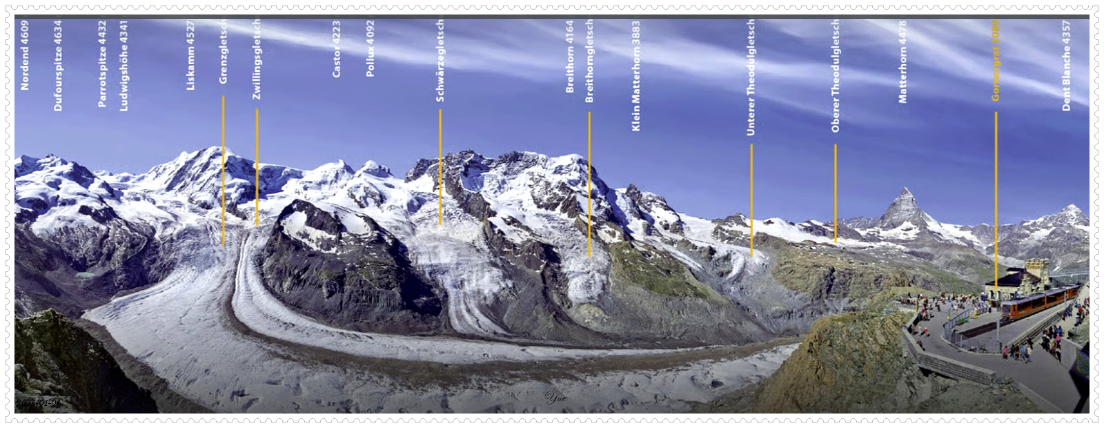 到达Gornergrat山顶观景台时(海拔3089米),约是下午2:33pm,阳光普照,碧空如洗,大半个山都裸露出黄土与岩石,不知是否是高山辐射的原因,气温也比想象的高,薄薄的羽绒小外衣都穿不住了。相比远处的孤峰马特宏峰, 正面连绵的罗莎山脉 Monte Rosa massif和戈尔内冰川Gorner Glacier则更有视觉震撼力, 我忍不住连线与正在波城上班的悦少们即时视频,分享眼前的壮阔。观景台上人不多,算算我们在这里居然待了近2个小时。360度全景视野,29座海拔四千米以上的山峰,大小冰川构成的冰川系统,延绵, 连续, 伸展,如此气势磅礴。