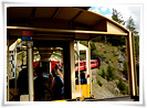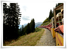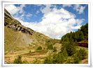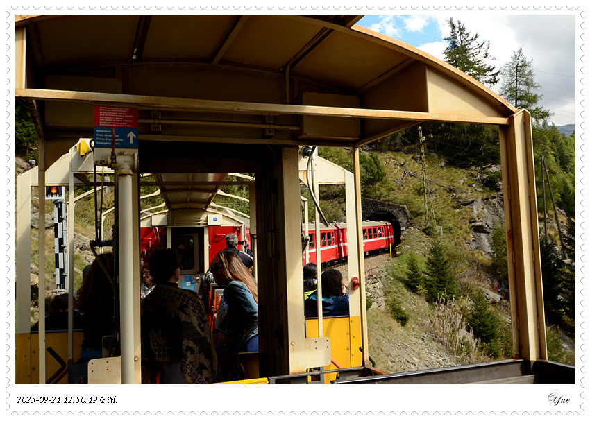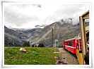 Tirano也没什么特别想看的,干脆就提前乘11:41am的回程车吧。 这班车后面居然有两个敞开的黄色木座车厢,这大概就是所谓为摄影爱好者的特殊车厢了。 这个挂斗式的敞篷木车厢,像拉羊拉草的,有点粗糙乡土。椅子是硬的,转弯是左右摇晃的,还有那么点咣当咣当的声音,很不瑞士,但是特自然!我喜欢, 更别说那无敌的开阔视野。