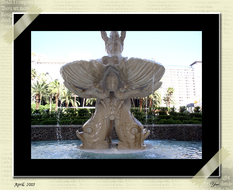 水, 总有这样一种沉静的魅力吧。而在赌城,沙漠变绿洲, 水火可共融。MIRAGE 门前这一大片的湖水瀑布, 夜暮降临之后, 忽有岩火喷涌,水面上火光四起,轰然做响,一颗心尚颤颤地抖着, 一切便又复归平静。