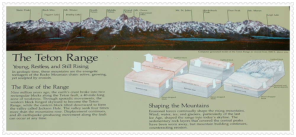 日月星辰, 风雷雨电, 地壳石沙,分工协作, 挤压,隆起,下陷, 风吹, 雨打, 侵蚀, 冲刷,切割, 沉积, 数百万年来无一时一刻之停歇。自然的大手,精雕细刻,大处隆隆挟雷霆万钧之势,小处春风化雨,精妙之所在无微不至。 二十五万年前开始,提顿山脉终于成型为今日之南北走向,直上直下,没有丘陵过渡的宏伟山系。